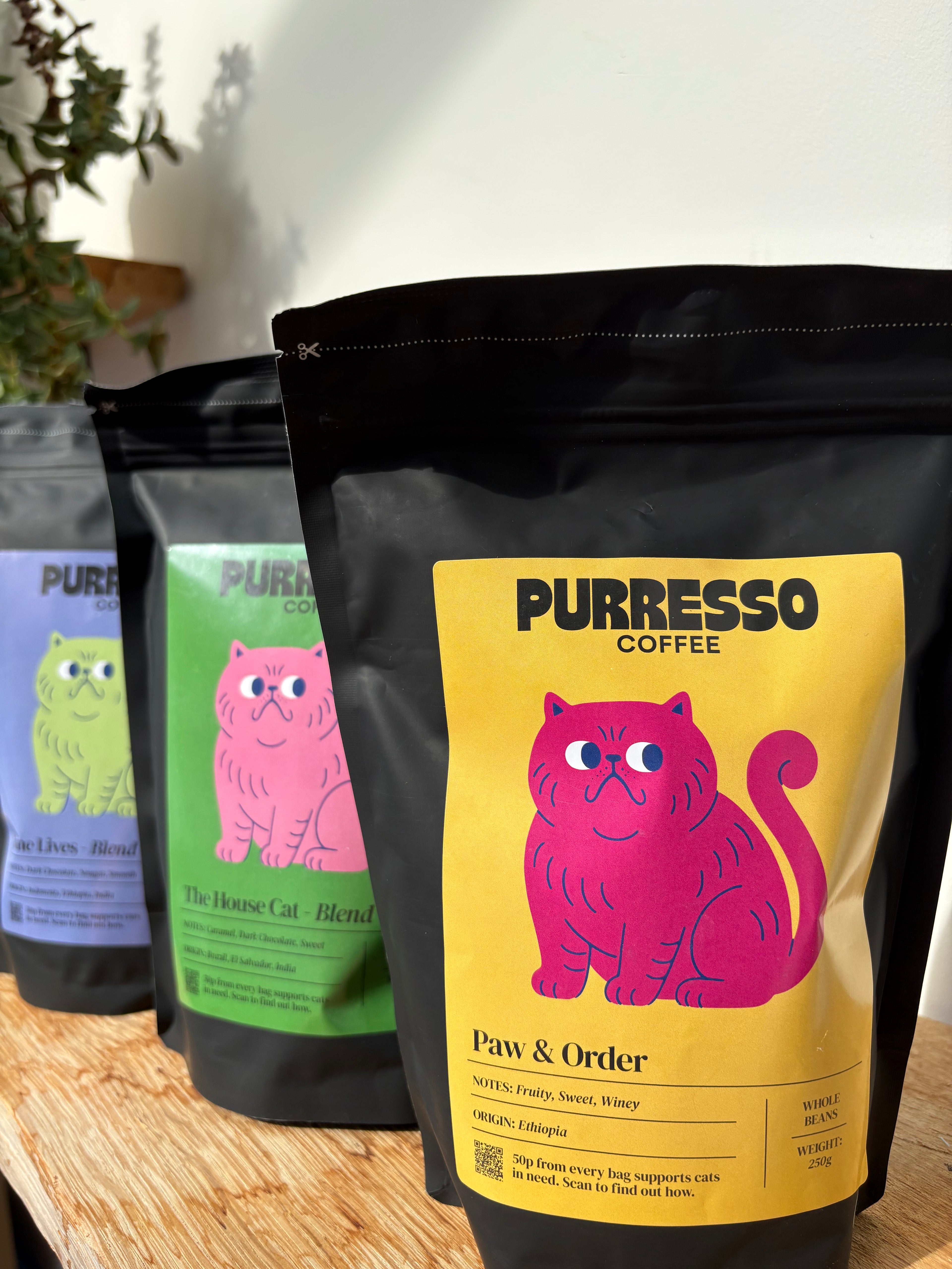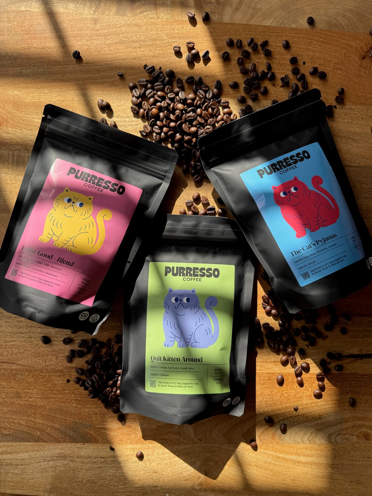 We offer freshly roasted specialty coffee delivered straight to your door, supporting a cat charity with every bag.